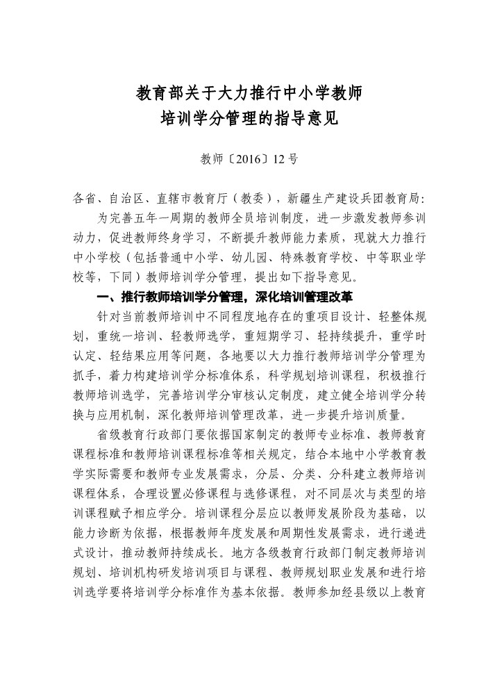 4.教育部关于大力推行中小学教师培训学分管理的指导意见(教师〔2016〕12号)