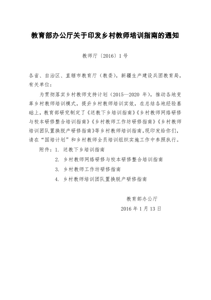 12.教育部办公厅关于印发乡村教师培训指南的通知(教师厅〔2016〕1号)
